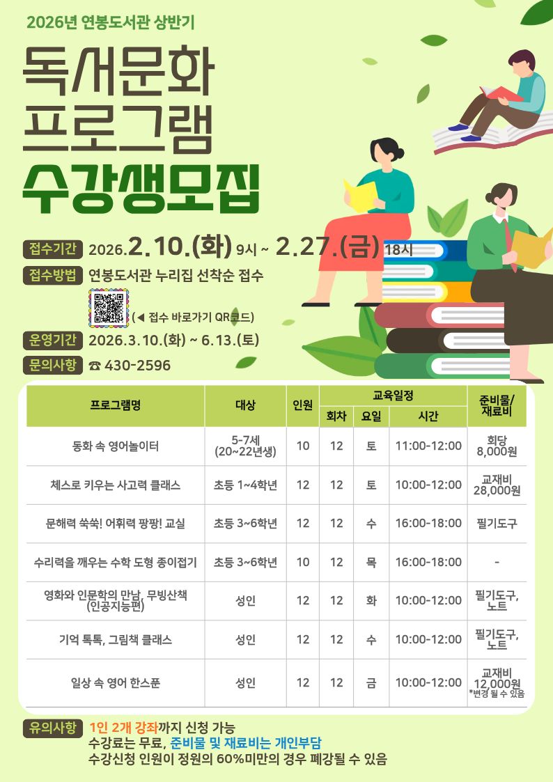 2026년 상반기 독서문화 프로그램 수강생을 모집합니다.